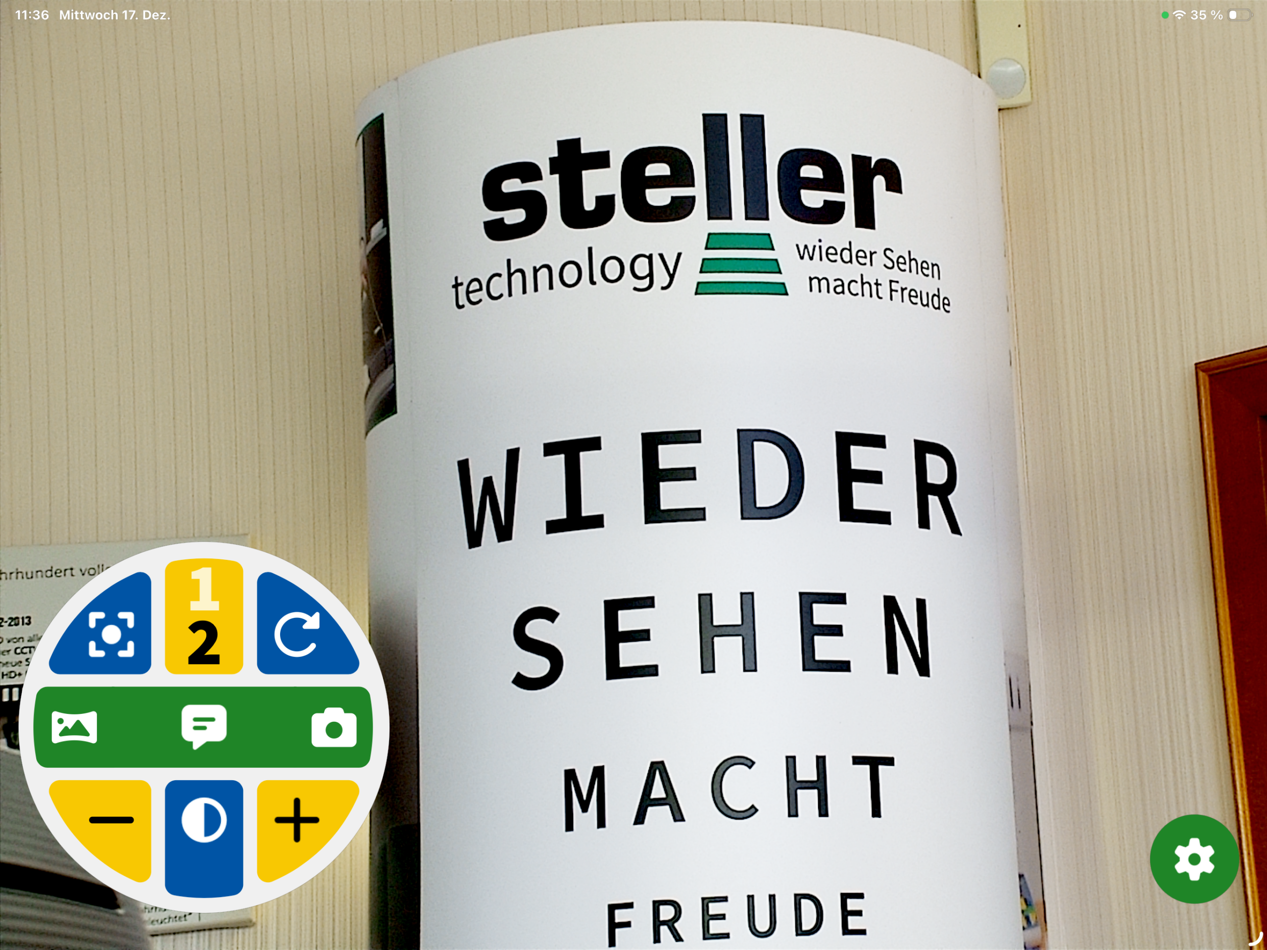 Die Bedienung ist einfach und erfolgt intuitiv. Mit der integrierten steller MyVision App wird das Kamerabild, die Vergrößerung, das Farbschema und der Kontrast geregelt. Eigene Profile können schnell abgerufen und Texte vorgelesen werden. (Auch Handschriften können vorgelesen werden.) Mit den integrierten Tasten an der PK8-Kamera kann die Vergrößerung zudem auch schnell und direkt eingestellt werden. Die Kamera kann am multifunktionalen Hybrid-Stativ in nahezu jede beliebige Position gedreht und geneigt werden. Mit einer klapp- und abnehmbaren Linse deckt sie sowohl den Fern- als auch den Nahbereich ab. Zusätzlich können individuelle Bildeinstellungen und Anpassungen vorgenommen, sowie Bilder abgespeichert werden.