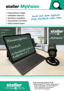 Das steller MyVision ist ein variables System für kleinsten Raum – ideal für Schule, Studium oder Arbeitsplatz. Bewährte steller Technik wird mit einem den individuellen Vorstellungen entsprechenden iPad, MacBook oder Mac kombiniert. Dazu wird das jeweilige System mit einer dreh- und schwenkbaren Kamera der steller-PK8-Serie ergänzt. Mit dieser können sowohl Präsentationen und Tafelbilder als auch Mitschriften und Buchtexte problemlos bis zu 360-fach vergrößert und vorgelesen werden.